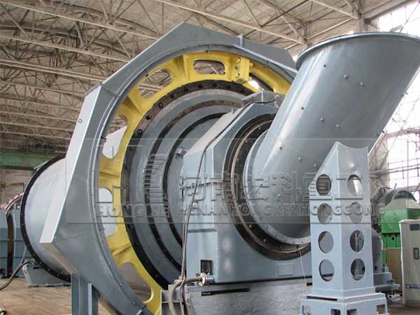原煤由喂料設(shè)備進(jìn)入到磨機(jī)的進(jìn)料裝置中,溫度為300℃左右的熱風(fēng)也通過進(jìn)風(fēng)管進(jìn)入進(jìn)料裝置,含有水分的原煤在此處就開始進(jìn)行熱交換;當(dāng)原煤進(jìn)入磨機(jī)的烘干倉時,由于烘干倉內(nèi)設(shè)有特制的揚(yáng)料板將原煤揚(yáng)起,使得原煤在此處進(jìn)行強(qiáng)烈的熱交換而得到烘干,烘干后的煤塊通過設(shè)有揚(yáng)料板的雙層隔倉板進(jìn)入粉磨倉。粉磨倉內(nèi)裝有研磨體(鋼球),煤塊在此倉內(nèi)被粉碎、研磨成煤粉。在煤塊被粉碎的同時,由專用的引風(fēng)機(jī)經(jīng)過磨機(jī)的出料裝置將已粉碎的煤粉及氣體一同帶出磨機(jī),較粗的顆粒會經(jīng)過出料裝置的返料螺旋返回到粉磨倉內(nèi)進(jìn)行再次粉磨。